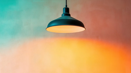 A chic black pendant light illuminates a vibrant wall featuring a blend of warm and cool colors, enhancing the modern interior atmosphere with elegance.