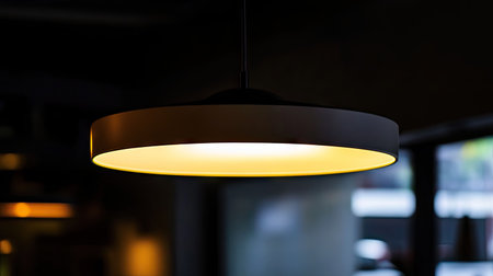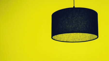 This stylish black pendant lamp features a minimalist design and casts a warm glow against a vibrant yellow background, perfect for modern interiors.