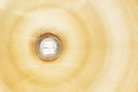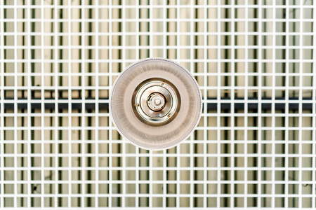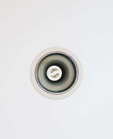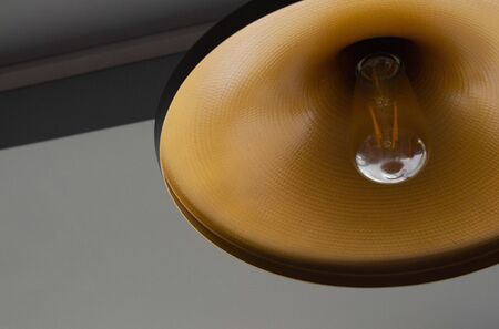 Unique lamp housing inside a coffee shop from below. Edison lamp is included in room.