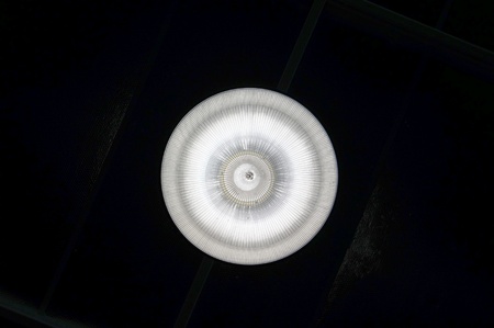 Cozy glow from a ceiling fixture in darkness, with soft shadows on the ceiling creating a serene and inviting scene.