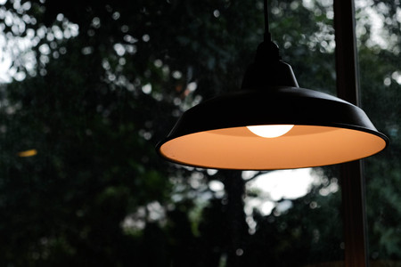 Decorative light bulb glowing in cafe. Idea for shop decoration. Vintage tone