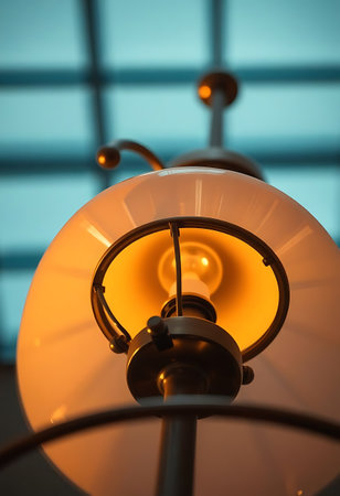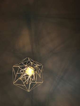 This closeup image showcases a stylish, contemporary light fixture suspended from the ceiling. Its intricate details and unique design captivate viewers, highlighting its aesthetic appeal
