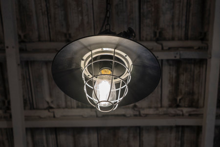 vintage lantern which has bulb inside and hanging on the ceiling of relaxing area, soft and selective focus.