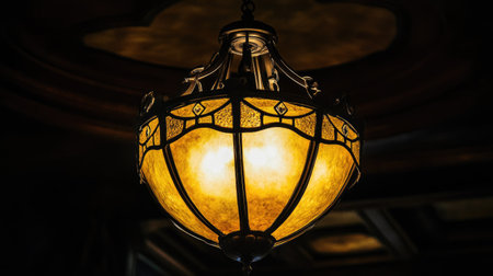 A ceiling lamp fixture casting warm, golden light in darkness, with soft shadows and a mysterious, moody atmosphere.