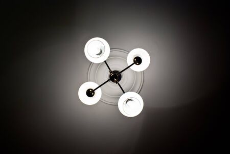 Chandelier on a light wooden ceiling of four light bulbs. Geometry in interior elements.