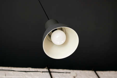 Hanging ceiling light bulb view from below. Modern living room black and white themed.