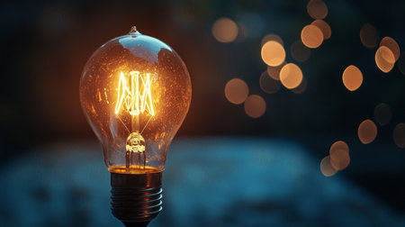 A glowing filament inside a vintage Edison-style light bulb with a blurred background of warm bokeh lights, creating a cozy ambiance.