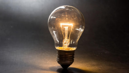Glowing light bulb held in hand, showcasing intricate filament details and warm illumination against textured background. image evokes creativity and inspiration