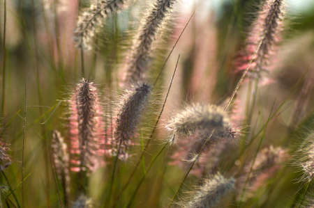 Colorful needle grass flowers field, blooming with reflection light from sunset in the evening nature background