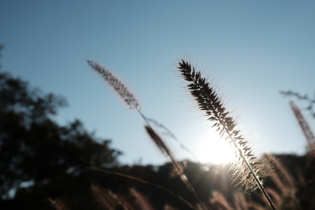 Grass flower in the evening light with sunset background. Soft focus.