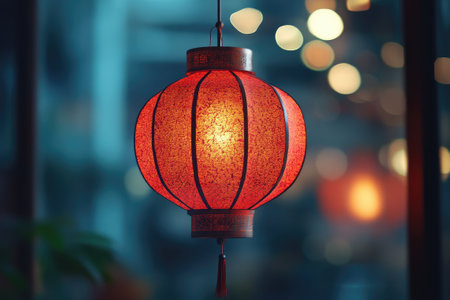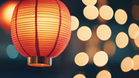 A vibrant red lantern illuminates the scene, suspended gracefully against a dreamy backdrop of soft bokeh lights. This image captures the warmth and festive spirit often associated with celebrations and cultural events