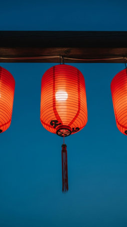 A striking vertical 9:16 composition showcasing three brightly lit red cylindrical lanterns hanging