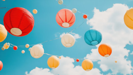 A stunning display of colorful lanterns suspended in mid-air, creating a festive ambiance against a backdrop of a blue sky dotted with fluffy clouds.