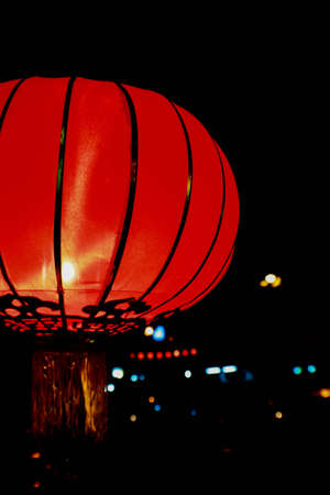 Red chinese paper lantern hanging and glowing at night with bokeh background