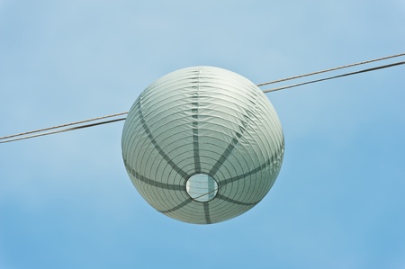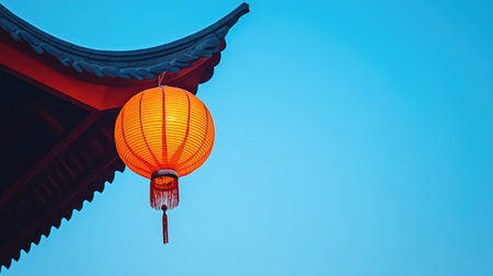 A stunning traditional Asian lantern hangs gracefully against a clear blue sky, exuding warmth and cultural charm. Ideal for themes of celebration and heritage.