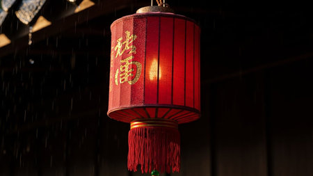 Red chinese lantern hanging over a street at night, glowing warmly for lunar new year celebrations, symbolizing good fortune, prosperity, tradition and community gathering