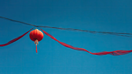 A single red lantern hangs suspended against a bright blue sky, accompanied by flowing red fabric. The image displays a clean composition, showcasing the contrast of colors and textures. This visual could be used in various commercial or editorial contexts to evoke feelings of celebration or decoration.