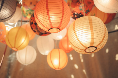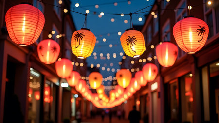Vibrant Festival Celebration with Lanterns, Colorful Decorations, and Joyful Atmosphere in Asia