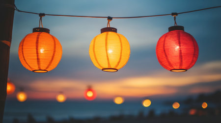 Vibrant lanterns hang over a beach during sunset, creating a warm and inviting atmosphere. This image captures the beauty of evening gatherings and relaxation.