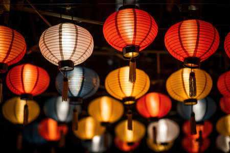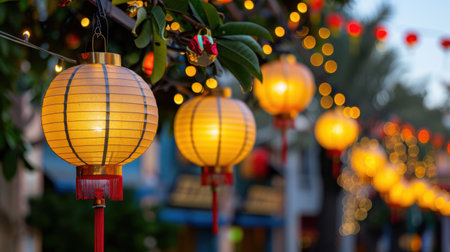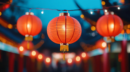 Colorful handmade paper lanterns glowing with warm light at dusk during an asian traditional lantern festival. Creating a vibrant and festive ambiance with a bokeh background
