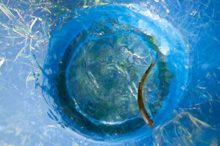 Small fish in a dark blue bucket. The first ulov of the fisherman - small small fry.