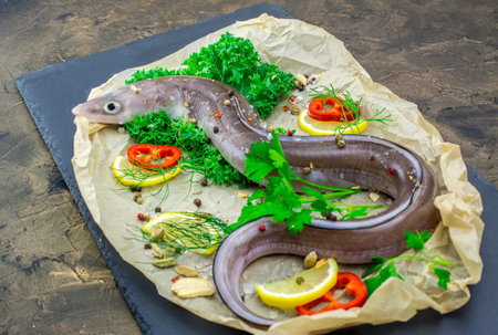 congor,sea eel unprepared with lemon pepper parsley on black board