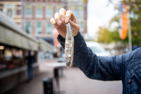 Hold herring with onions by the tail. Food from a fish restaurant in Holland