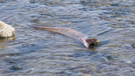 Ambon Island, Indonesia. Eels in the sacred eel in Waai village. Giant eel Morea. Tourist attraction in the water of Waiselaka. Maluku, Asia