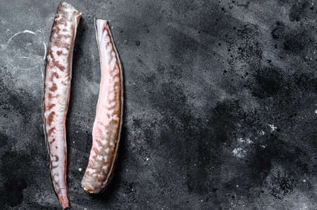 Raw sea eel fish. Black background. Top view. Copy space.