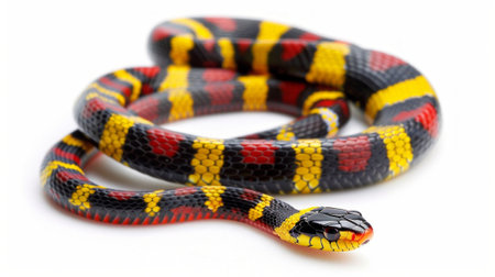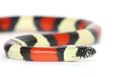 An Eastern Coral Snake moves gracefully with its characteristic red yellow and black bands. The snakes detailed markings are showcased against a bright white backdrop.
