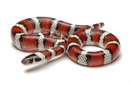 Red and black striped kingsnake, Lampropeltis triangulata, on white background