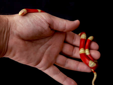 Man holds in hands reptile Milk snake Lampropeltis triangulum Arizona kind of snake.