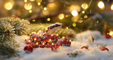 Festive snake with Christmas lights in snow, holiday decoration concept.