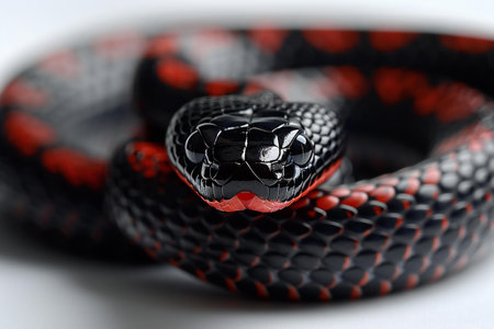 Vibrant red, orange, and black snake glistens under soft light in an artistic close-up