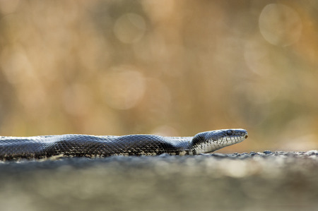 Colorful snake with distinctive patterns exploring its surroundings in natural habitat during daylight hours