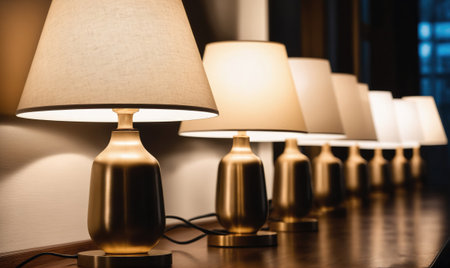 A row of brass table lamps with white shades illuminate a table