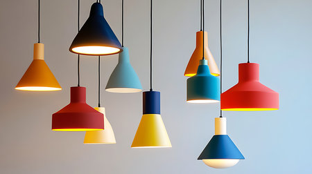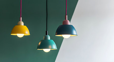 Modern pendant lamps in vibrant colors, yellow, teal, and blue, hang elegantly against a green and white wall, creating a stylish ambiance for contemporary spaces, AI generated