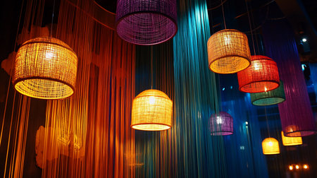 A low-angle shot of several woven lamps in orange, red, purple, and yellow, hanging against colorful string curtains in a dark interior, creating a warm and inviting atmosphere.