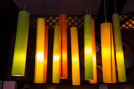 Colorful electric lamp hanging on the wood ceiling.