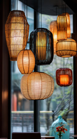 Woven lanterns of various sizes illuminate the cozy dining space, casting warm light. Outside the large window, greenery adds a peaceful ambiance to the setting. AI Generative