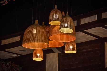 lamps in straw shades on the ceiling for decoration