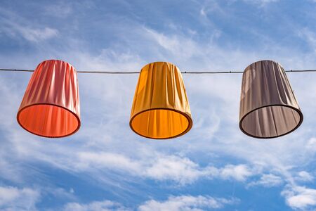 Hanging color lampshades on dark background. Composition of multi-colored chandeliers in interior design.