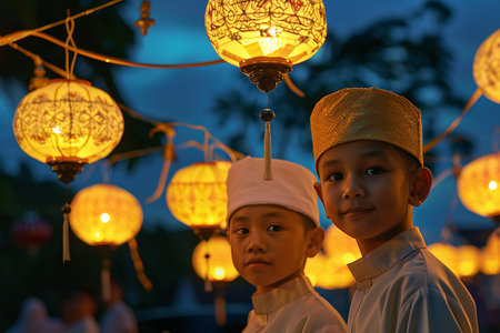 Generative AI Image of Muslim Boys Children Celebrate Malaysia Independence Day with Lantern at Night