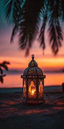 An ornate lantern glows with warm light, set against a vibrant sunset over water. Dark palm leaves frame the composition, creating a sense of depth. The image displays a soft focus and rich color palette. Suitable for a variety of uses, including illustrations and editorial content.