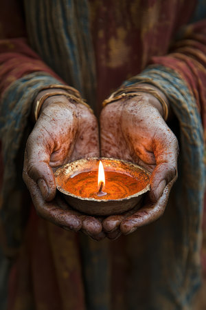 Two hands cradle a clay lamp glowing warmly with a flame, showcasing intricate decorations and dirt from a festive celebration in a culturally rich setting at twilight.