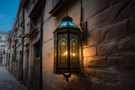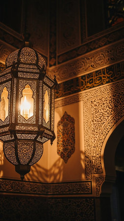 Metalwork showing ornate antique islamic lantern with intricate metalwork and arabic calligraphy glowing with warm light against a dark shadowy background creating...