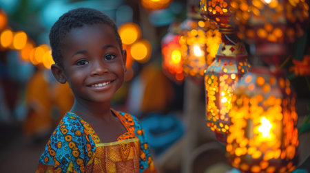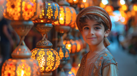 Ai Generative photo of a happy muslim boy with ramadan lanterns in streets