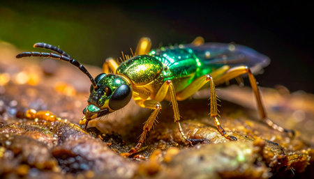 A stunning close-up image of a vibrant beetle showcasing its shiny, iridescent colors while resting on a rock in its natural habitat surrounded by lush greenery.