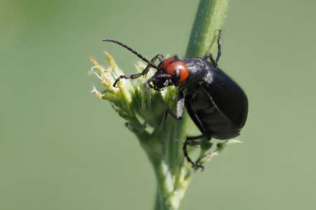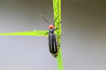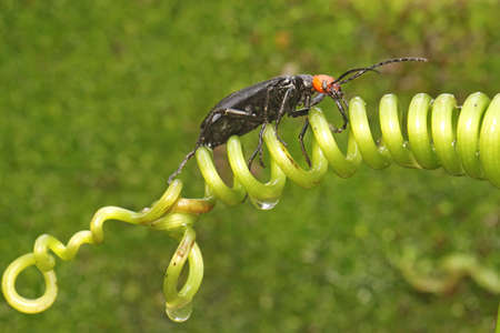 Orange,red beetle with a beautiful color grasping the green leaves in the natural garden.