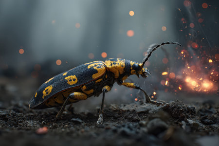 Colorful yellow spotted striped adult fire beetle exploring a smoky terrain with glowing embers under low light conditions